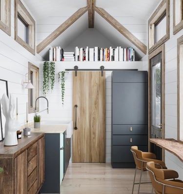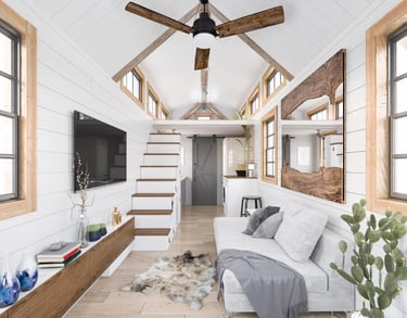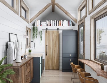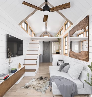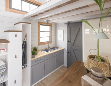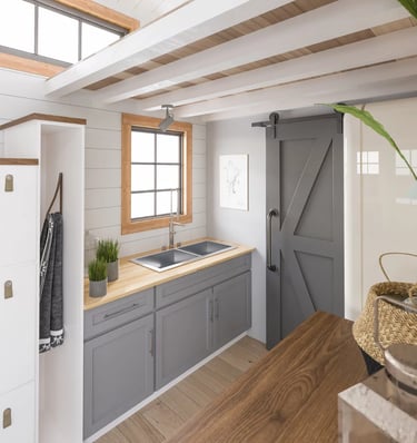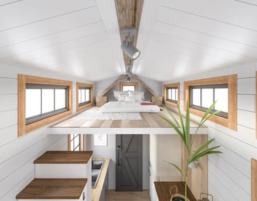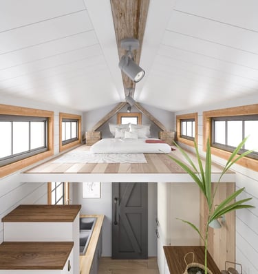 The 'Tiny Living' design consists of a large family room with vaulted ceilings and large dormers on either side of the room. The entryway is situated at the back of the trailer allowing for a spacious 7 foot sleeping loft at the front. Under the sleeping loft is the bathroom and the kitchen. This house is available in 12', 16', and 20' lengths, all of which are comfortably yet easy to tow.